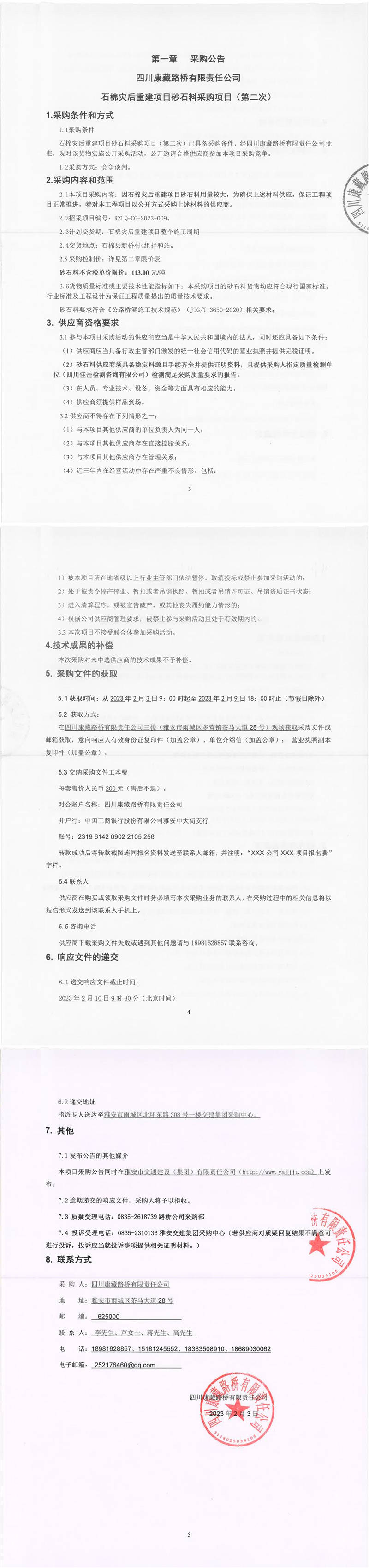 四川康藏路橋有限責任公司石棉災后重建項目砂石料采購項目(第二次)采購公告