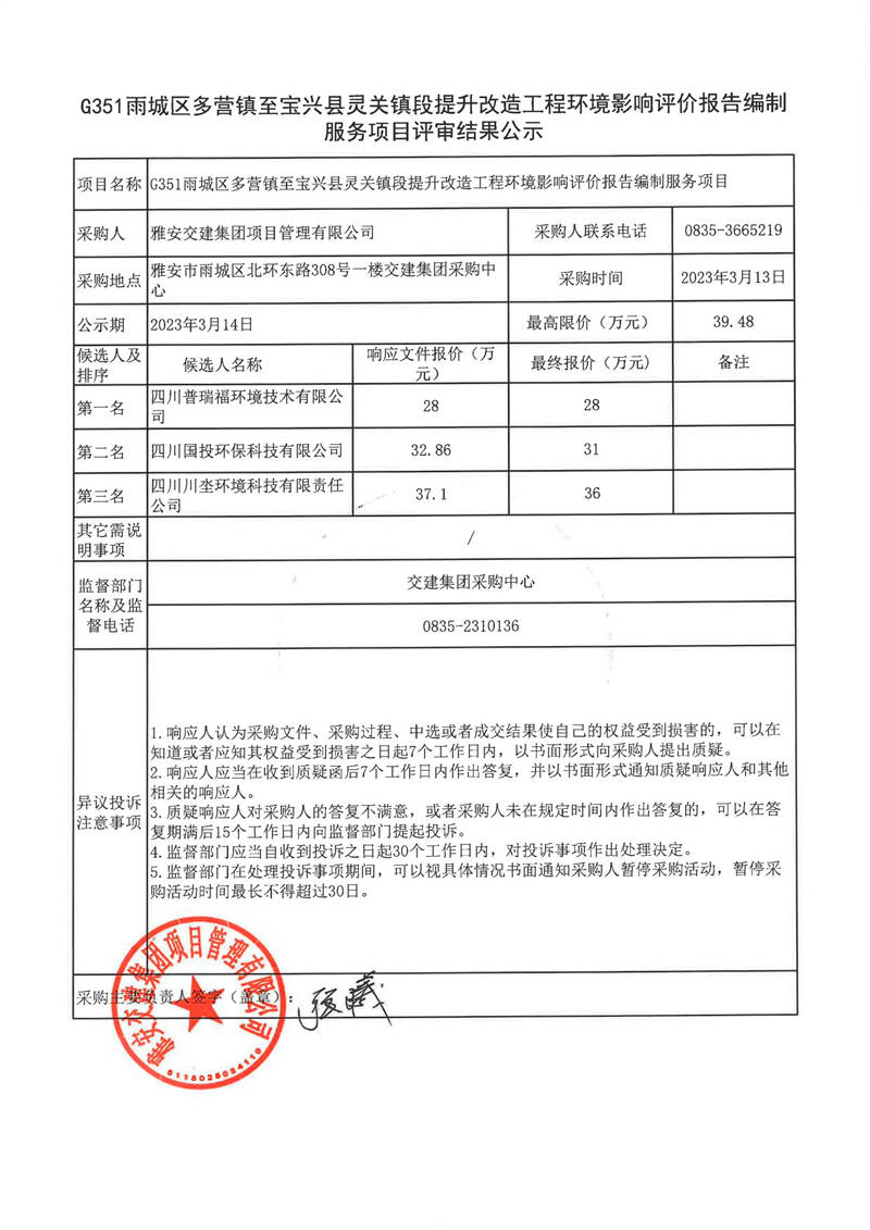 雅安交建集團項目管理有限公司G351雨城區(qū)多營鎮(zhèn)至寶興縣靈關鎮(zhèn)段提升改造工程環(huán)境影響評價報告編制服務項目結果公示