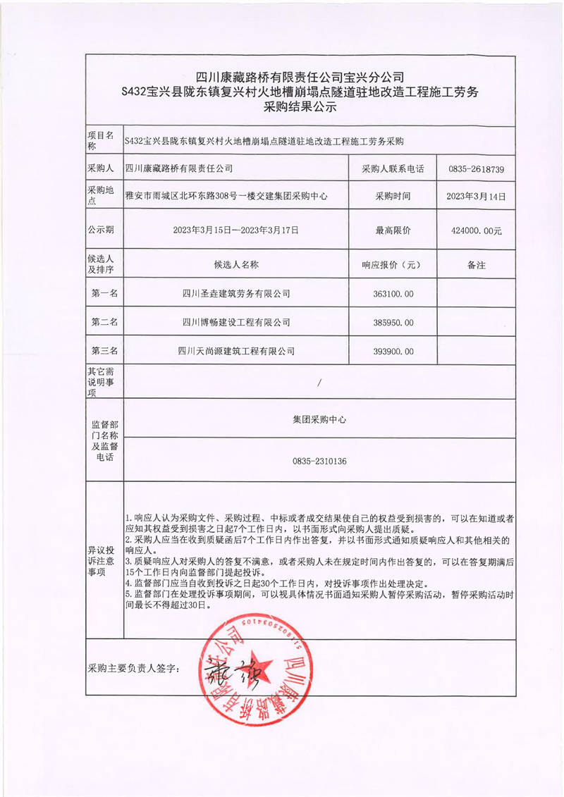 四川康藏路橋有限責任公司寶興分公司S432寶興縣隴東鎮(zhèn)復興村火地槽崩塌點隧道駐地改造工程施工勞務采購結果公示