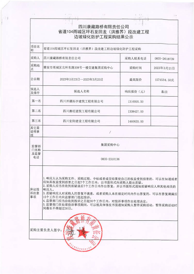 四川康藏路橋有限責(zé)任公司省道104雨城區(qū)坪石至回龍(洪雅界)段改建工程邊坡綠化防護工程采購結(jié)果公示