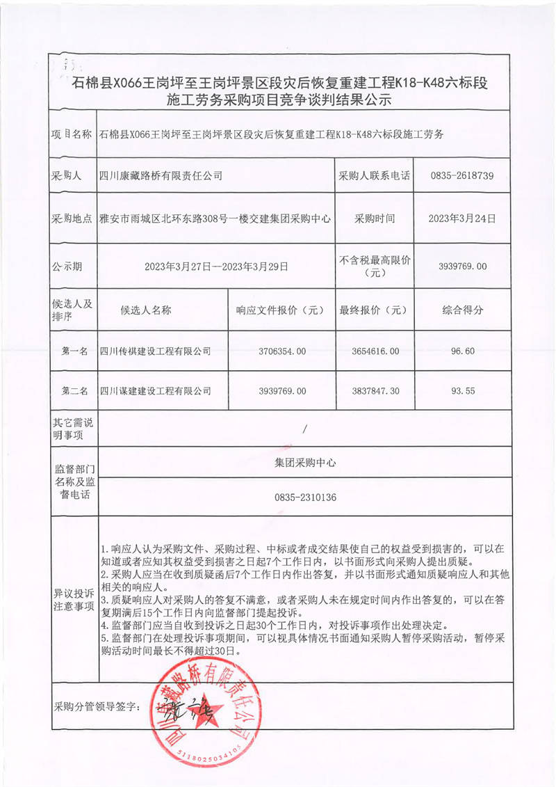 四川康藏路橋有限責任公司S431蘆山縣龍門至雙石段改建工程項目K18+000-K23+000路路基附屬工程施工勞務采購項目競爭談判結果公示