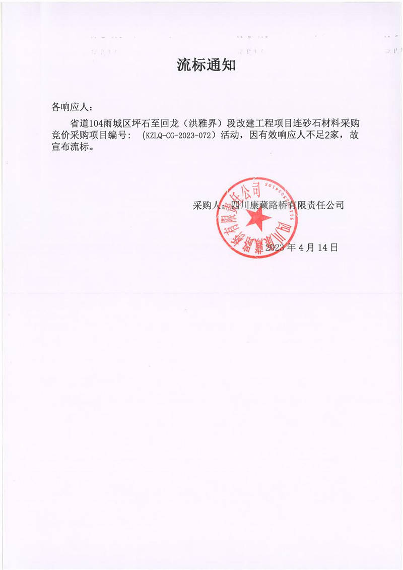 四川康藏路橋有限責任公司省道104雨城區(qū)坪石至回龍(洪雅界)段改建工程項目連砂石材料采購流標通知