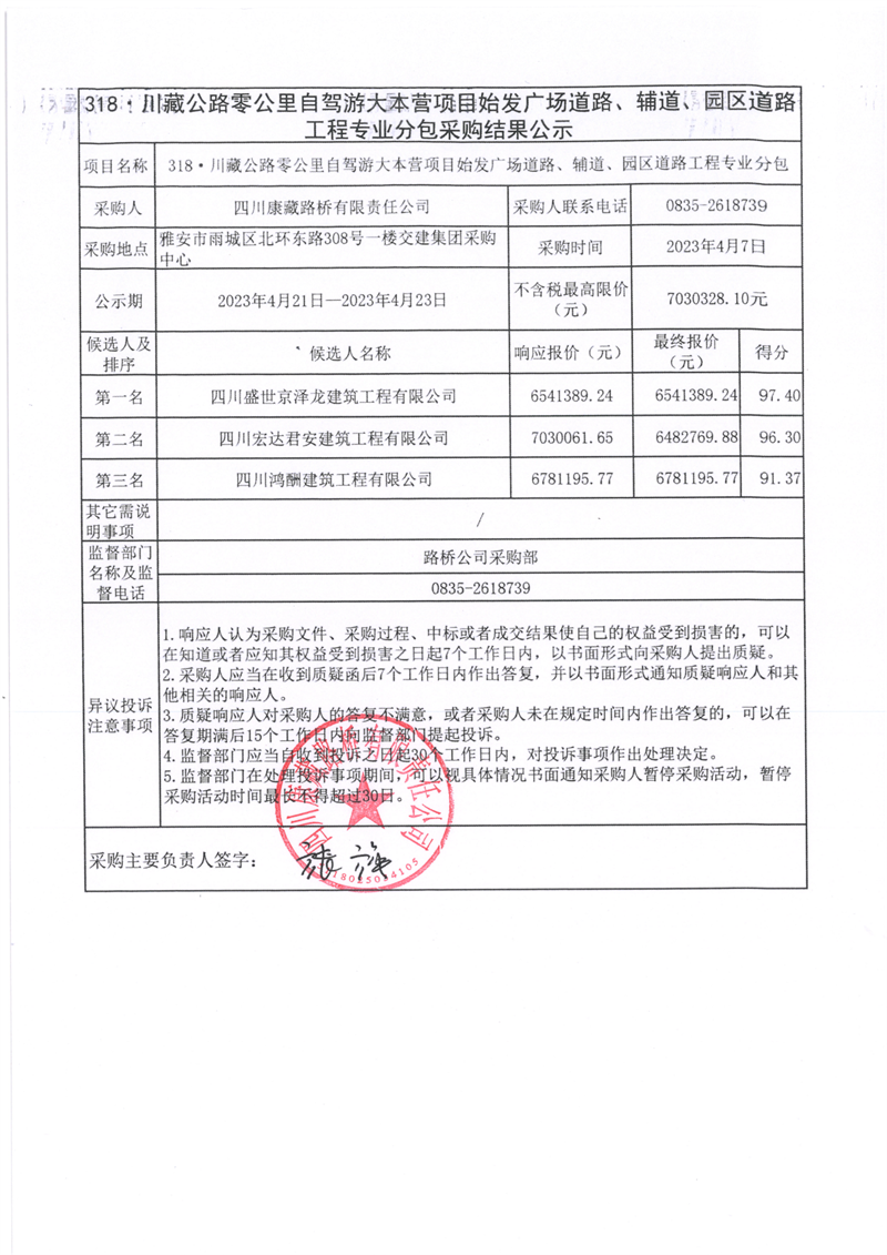 四川康藏路橋有限責任公司318·川藏公路零公里自駕游大本營項目始發(fā)廣場道路、輔道、園區(qū)道路工程專業(yè)分包采購結(jié)果公示