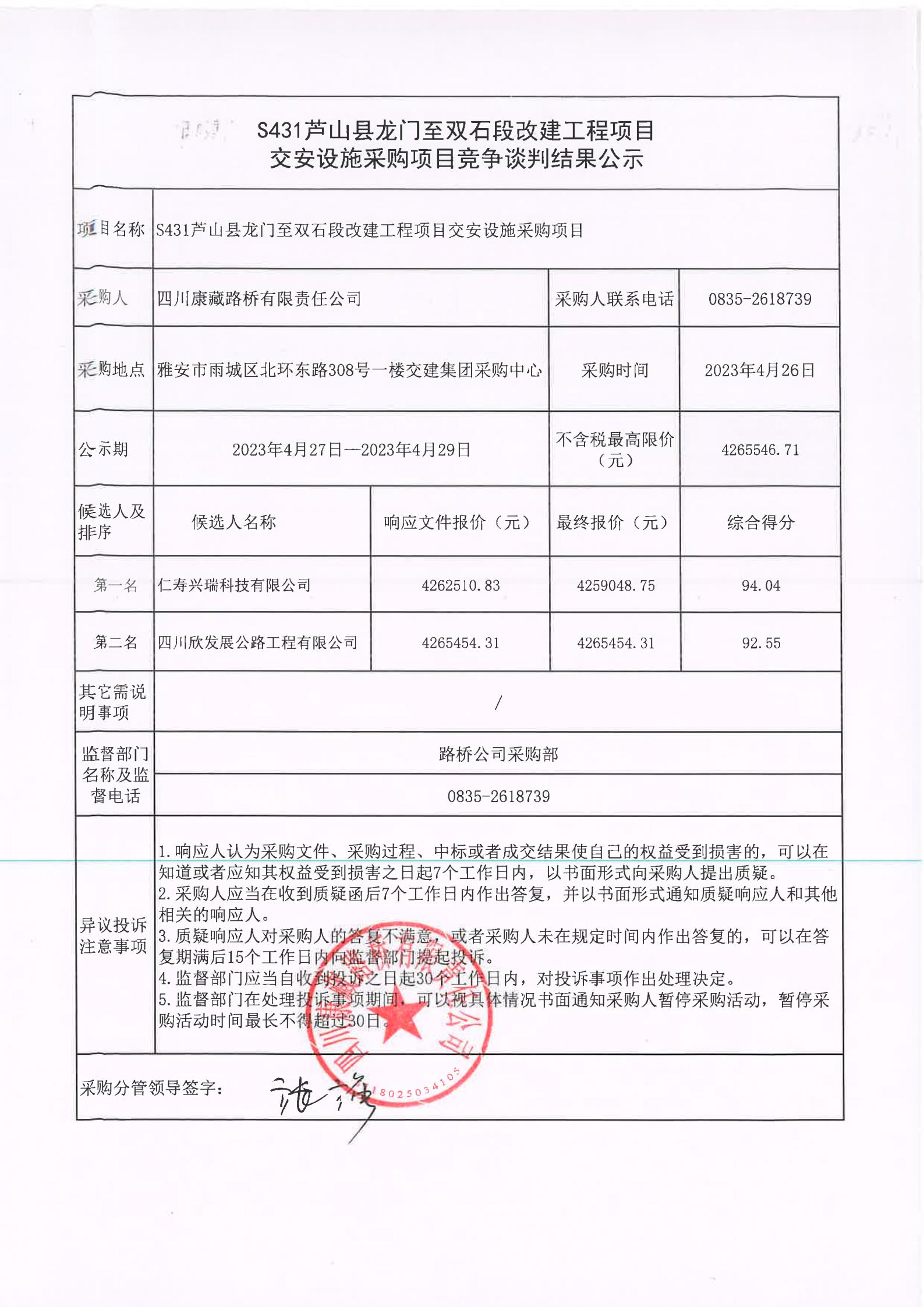 四川康藏路橋有限責(zé)任公司S431蘆山縣龍門至雙石段改建工程項(xiàng)目交安設(shè)施采購項(xiàng)目競爭談判結(jié)果公示