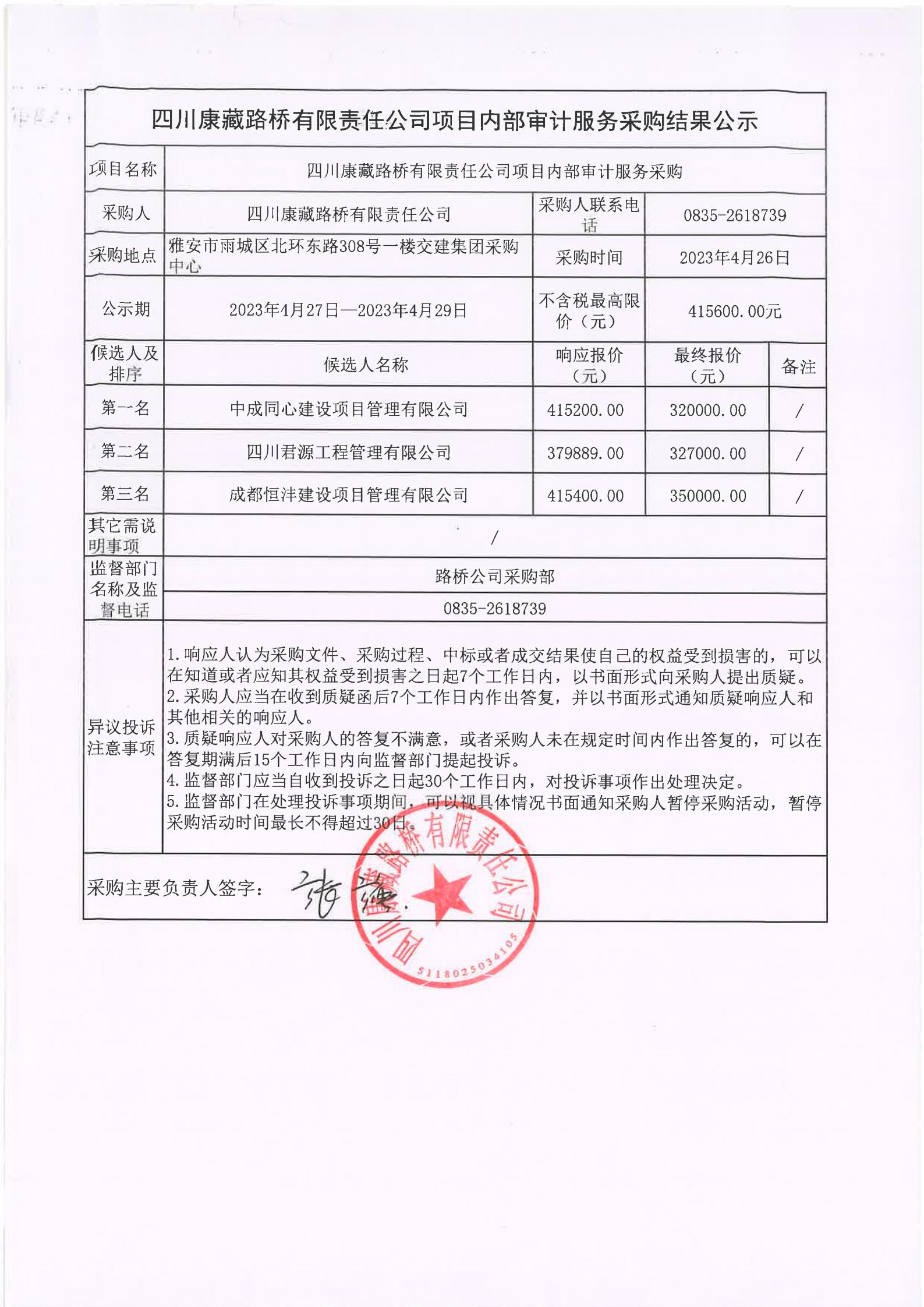 四川康藏路橋有限責任公司項目內(nèi)部審計服務(wù)采購結(jié)果公示
