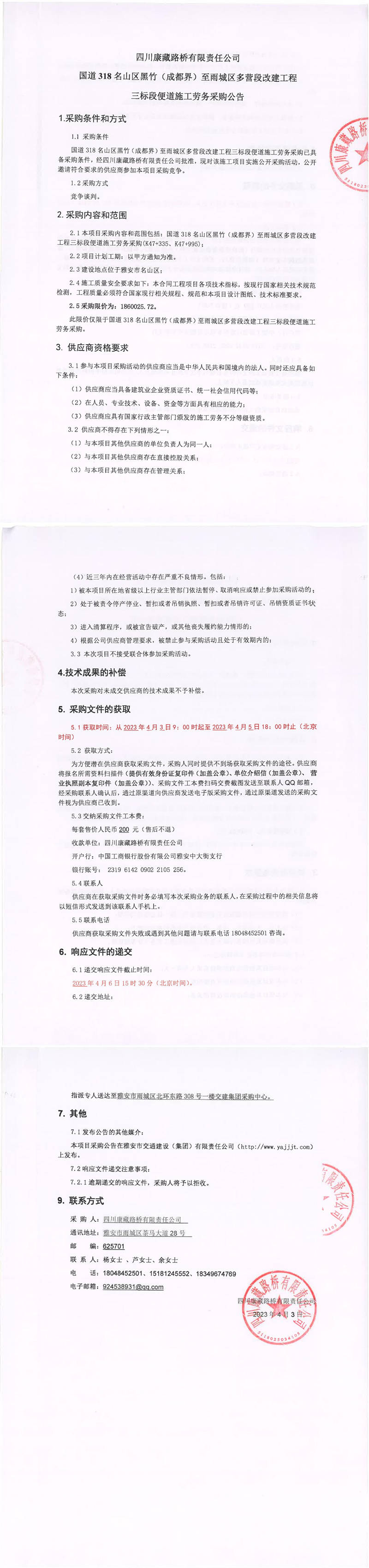 四川康藏路橋有限責(zé)任公司國(guó)道318名山區(qū)黑竹(成都界)至雨城區(qū)多營(yíng)段改建工程三標(biāo)段便道施工勞務(wù)采購(gòu)公告
