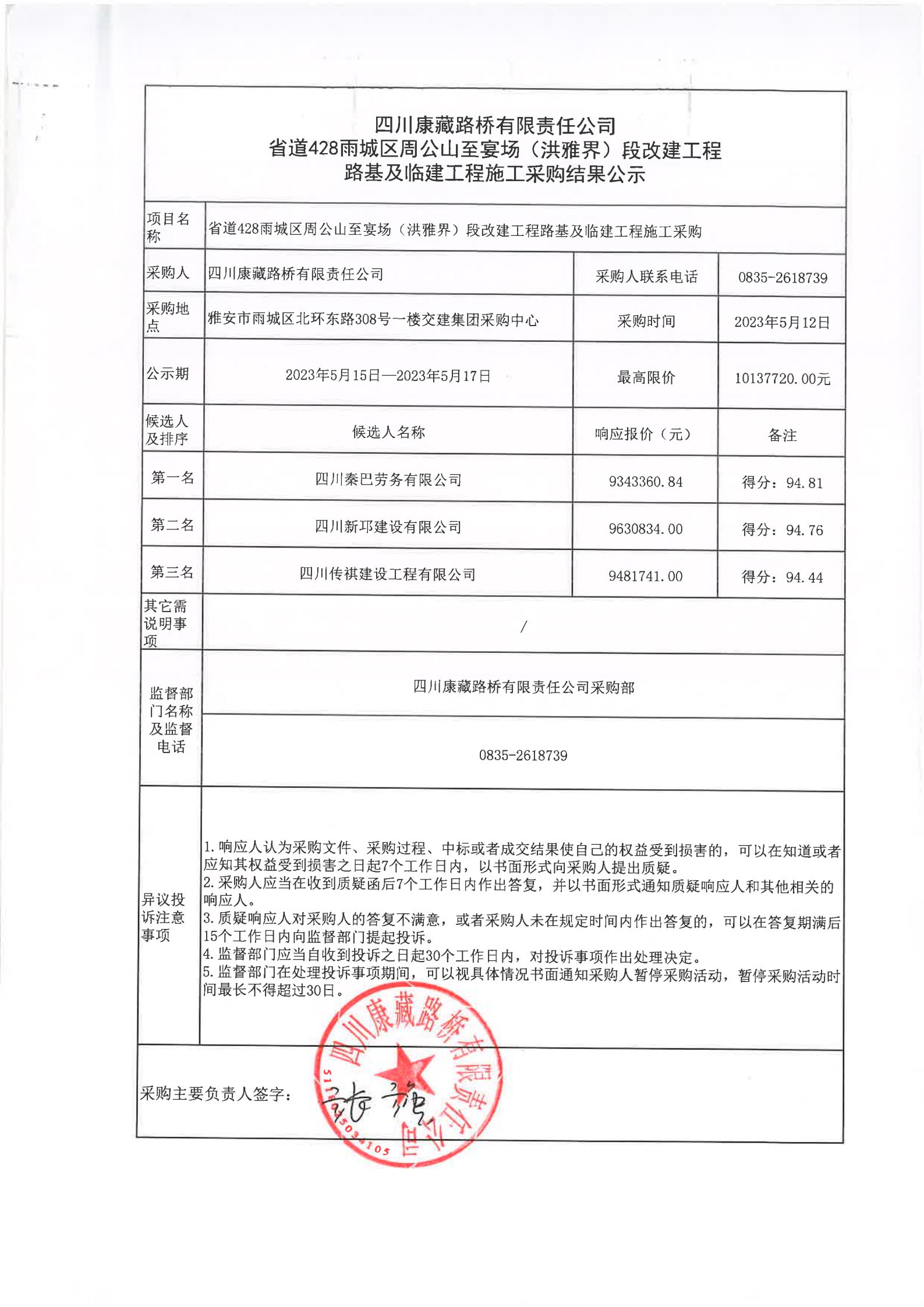 四川康藏路橋有限責任公司省道428雨城區(qū)周公山至宴場(洪雅界)段改建工程路基及臨建工程施工采購結(jié)果公示