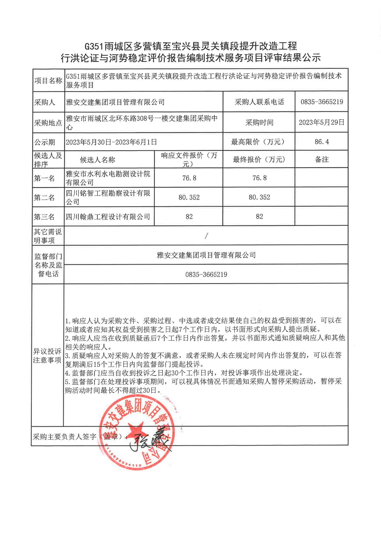 雅安交建集團項目管理有限公司G351雨城區(qū)多營鎮(zhèn)至寶興縣靈關(guān)鎮(zhèn)段提升改造工程行洪論證與河勢穩(wěn)定評價報告編制技術(shù)服務項目評審結(jié)果公示