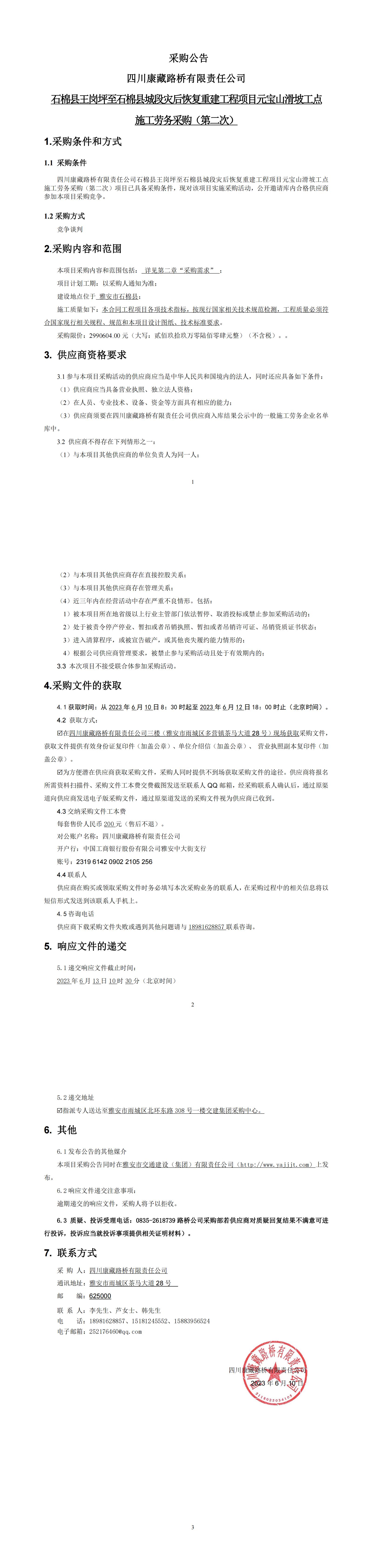 四川康藏路橋有限責(zé)任公司石棉縣王崗坪至石棉縣城段災(zāi)后恢復(fù)重建工程項(xiàng)目元寶山滑坡工點(diǎn)施工勞務(wù)采購(第二次)