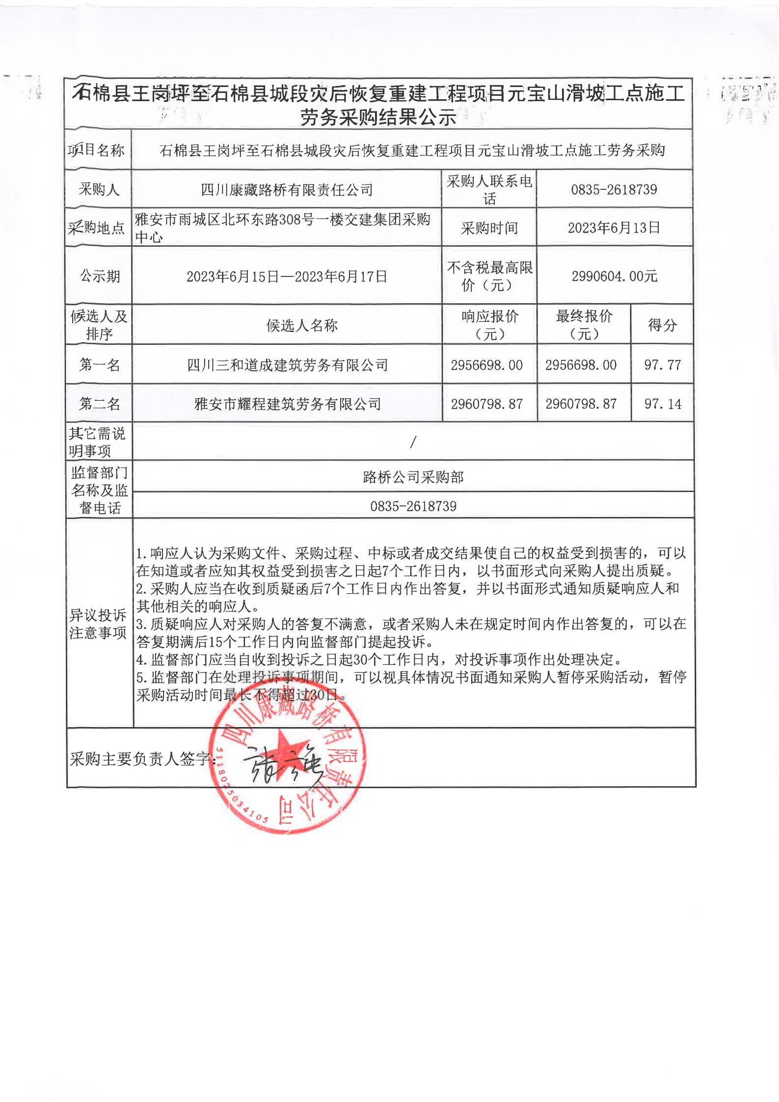 四川康藏路橋有限責(zé)任公司石棉縣王崗坪至石棉縣城段災(zāi)后恢復(fù)重建工程項(xiàng)目元寶山滑坡工點(diǎn)施工勞務(wù)采購(gòu)結(jié)果公示