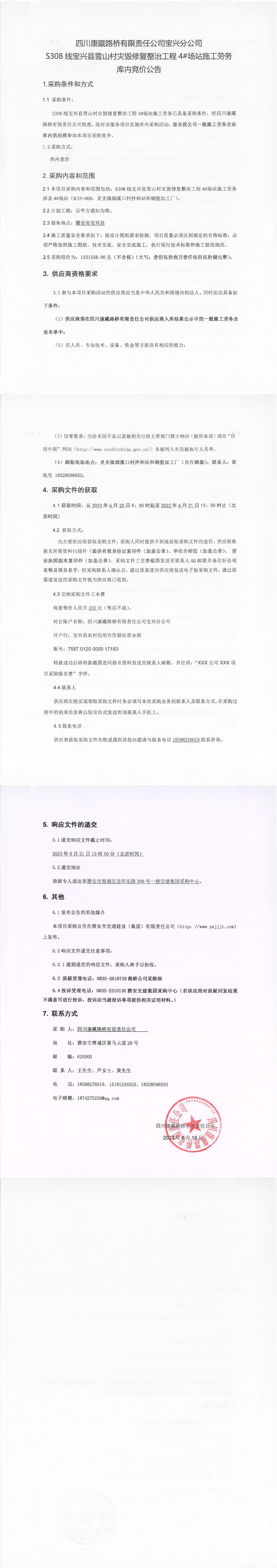 四川康藏路橋有限責任公司寶興分公司S308線寶興縣雪山村災毀整治工程4#場站施工勞務庫內(nèi)競價公告