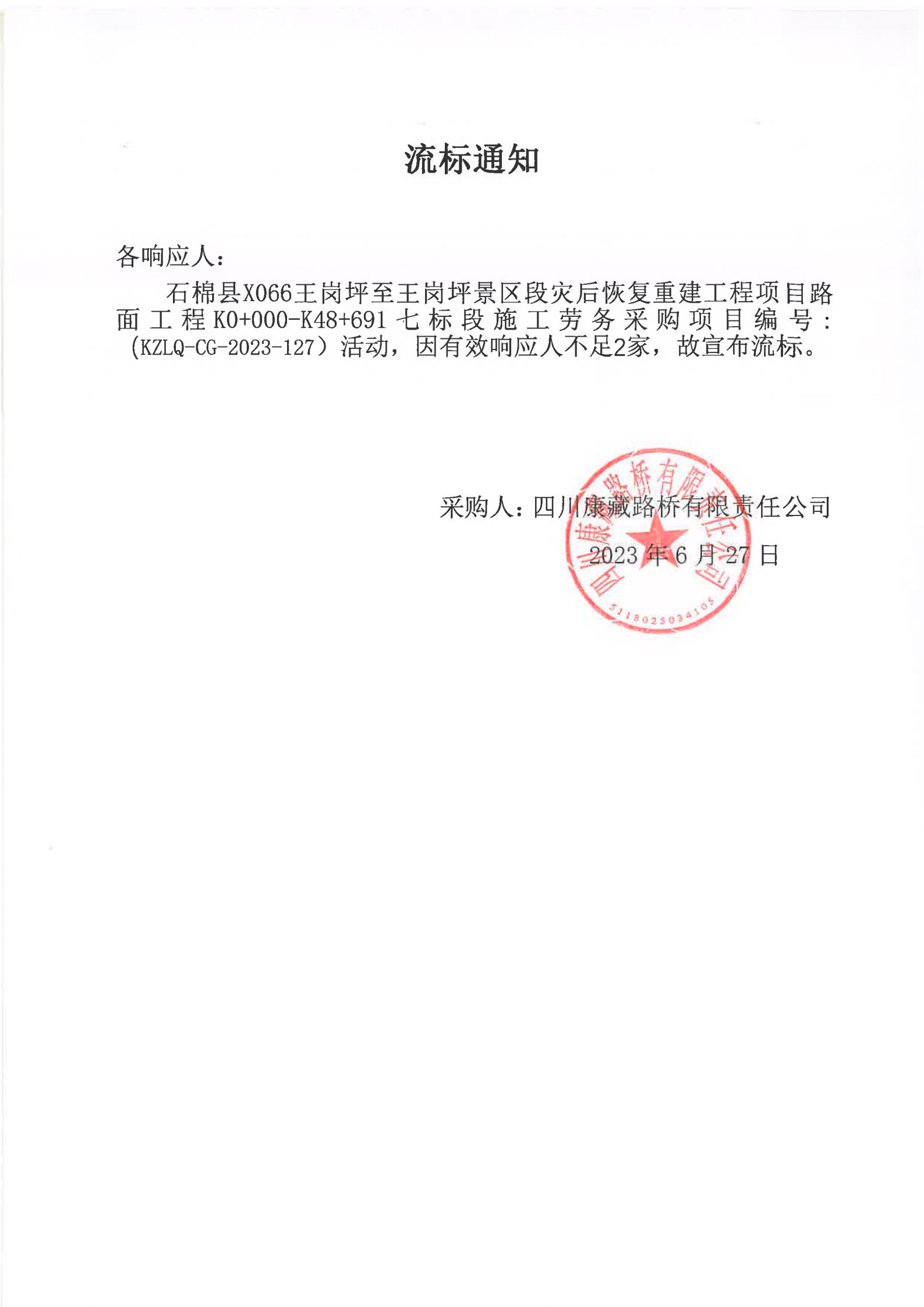 四川康藏路橋有限責(zé)任公司石棉縣X066王崗坪至王崗坪景區(qū)段災(zāi)后恢復(fù)重建工程項(xiàng)目路面工程K0+000-K48+691七標(biāo)段施工勞務(wù)采購(gòu)流標(biāo)通知