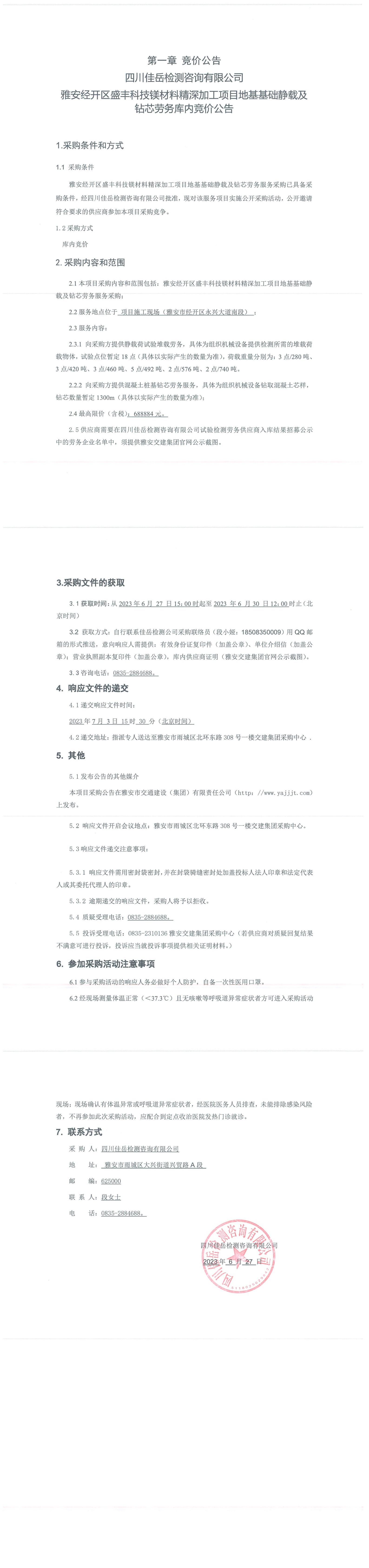 四川佳岳檢測咨詢有限公司雅安經(jīng)開區(qū)盛豐科技鎂材料精深加工項(xiàng)目地基基礎(chǔ)靜載及鉆芯勞務(wù)庫內(nèi)競價(jià)公告