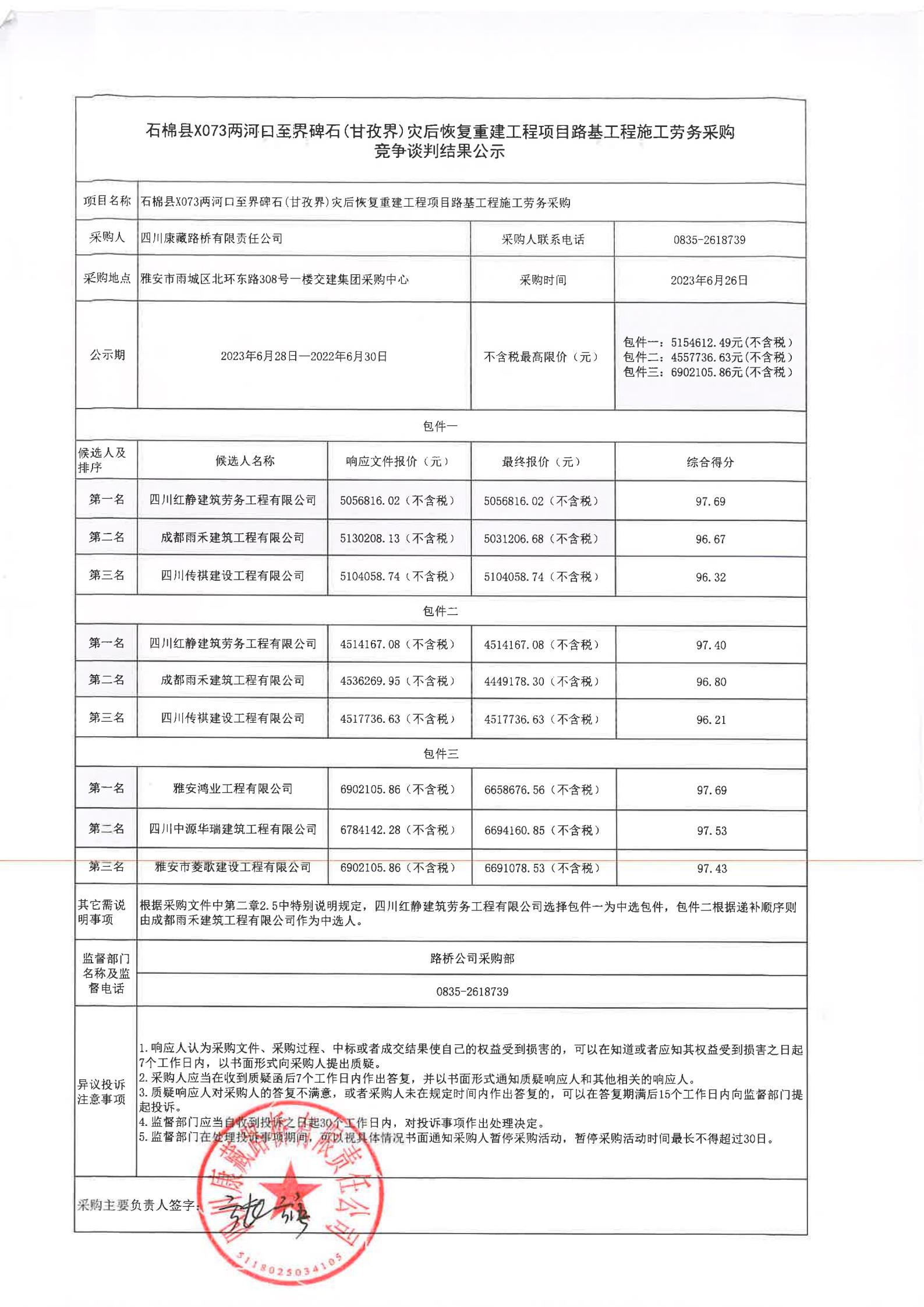四川康藏路橋有限責任公司石棉縣X073兩河口至界碑石(甘孜界)災后恢復重建工程項目路基工程施工勞務(wù)采購競爭談判結(jié)果公示