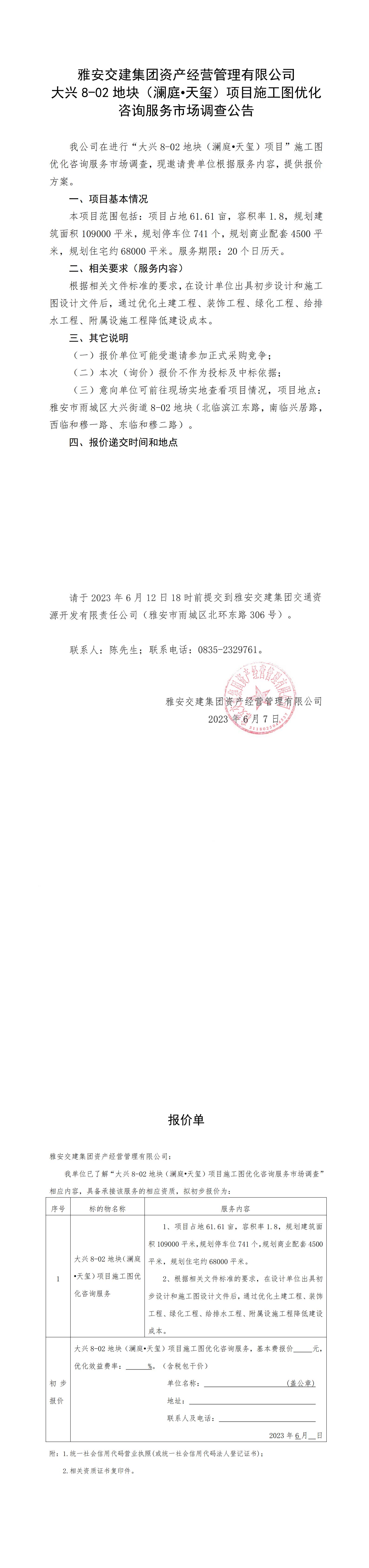 雅安交建集團(tuán)資產(chǎn)經(jīng)營(yíng)管理有限公司大興8-02地塊(瀾庭·天璽)項(xiàng)目施工圖優(yōu)化咨詢服務(wù)市場(chǎng)調(diào)查公告