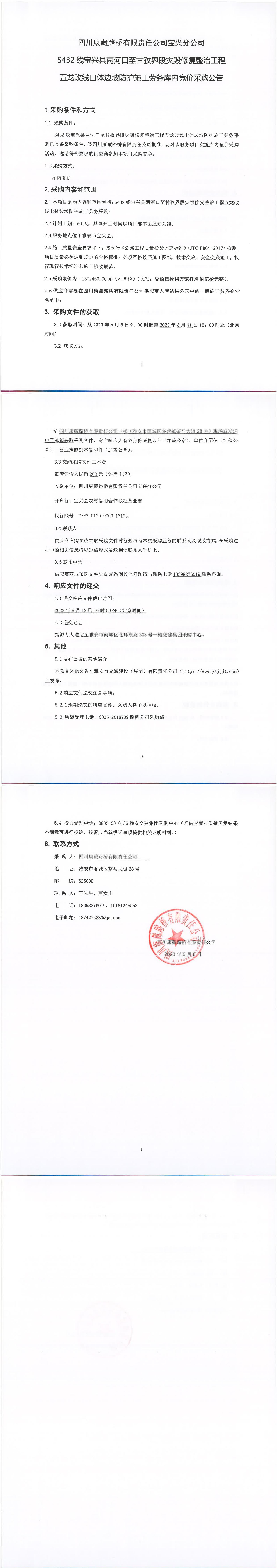 四川康藏路橋有限責(zé)任公司S432線寶興縣兩河口至甘孜界段災(zāi)毀修復(fù)整治工程五龍改線山體邊坡防護(hù)施工勞務(wù)庫內(nèi)競價采購公告