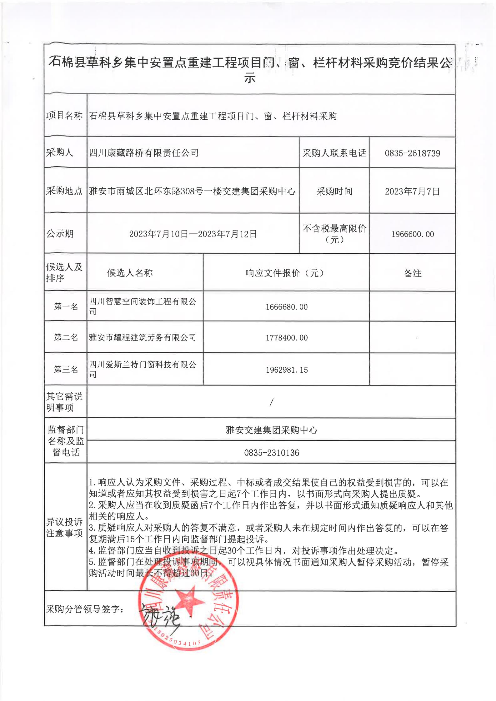 四川康藏路橋有限責(zé)任公司石棉草科鄉(xiāng)集中安置點重建工程項目門、窗、欄桿材料采購競價結(jié)果公示