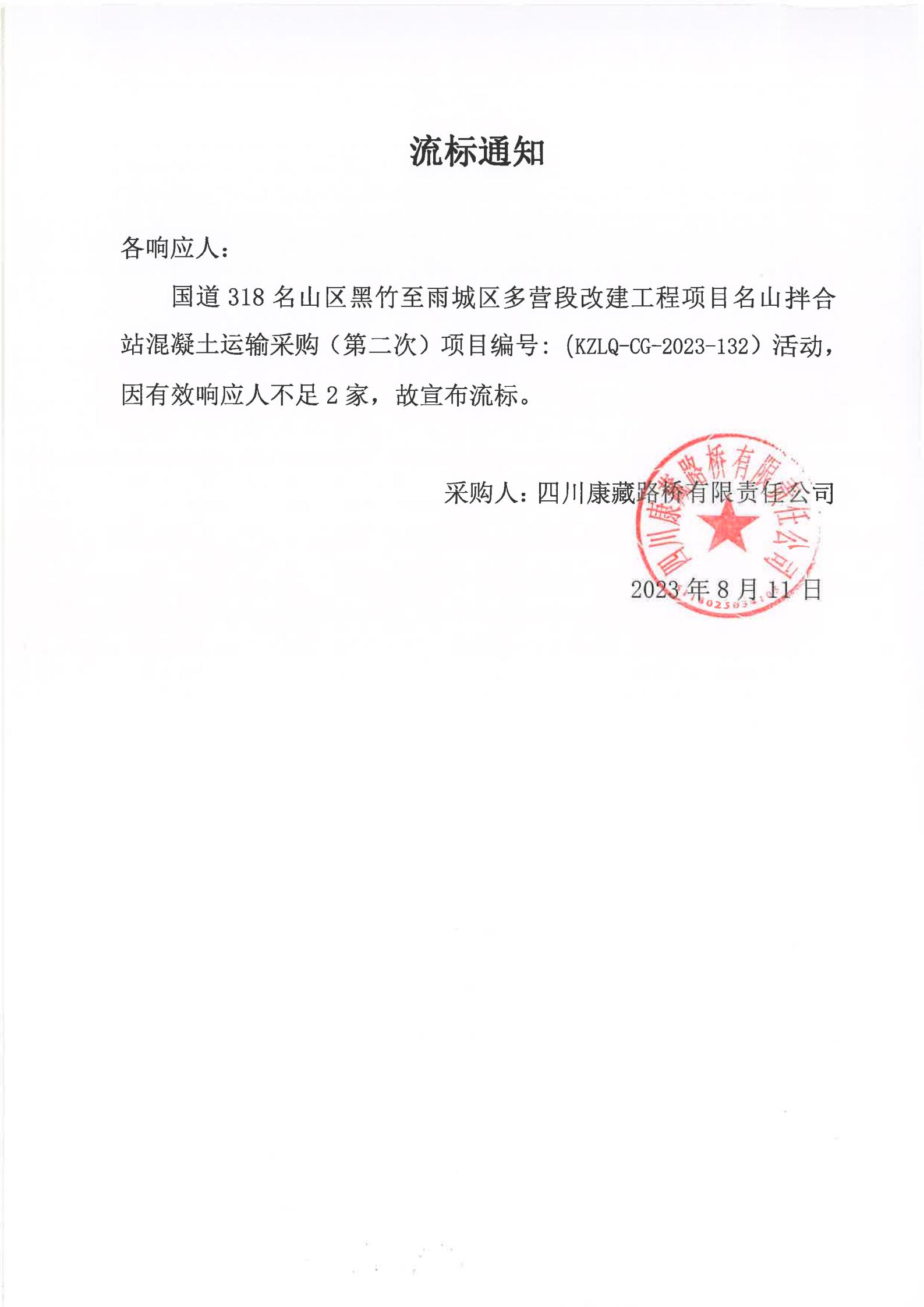 四川康藏路橋有限責(zé)任公司國道318名山區(qū)黑竹至雨城區(qū)多營段改建工程項(xiàng)目名山拌合站混凝土運(yùn)輸服務(wù)(第二次)流標(biāo)通知)