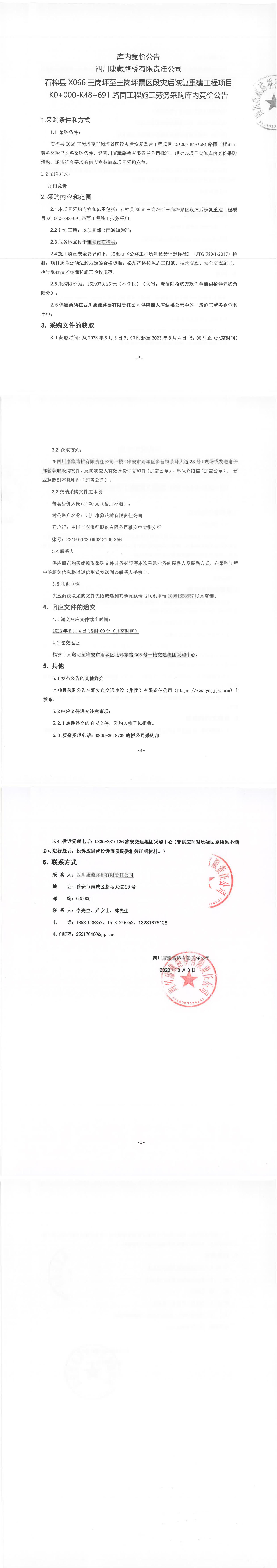 四川康藏路橋有限責(zé)任公司石棉縣X066王崗坪至王崗坪景區(qū)段災(zāi)后恢復(fù)重建工程項(xiàng)目K0+000-K48+691路面工程施工勞務(wù)采購庫內(nèi)競價公告