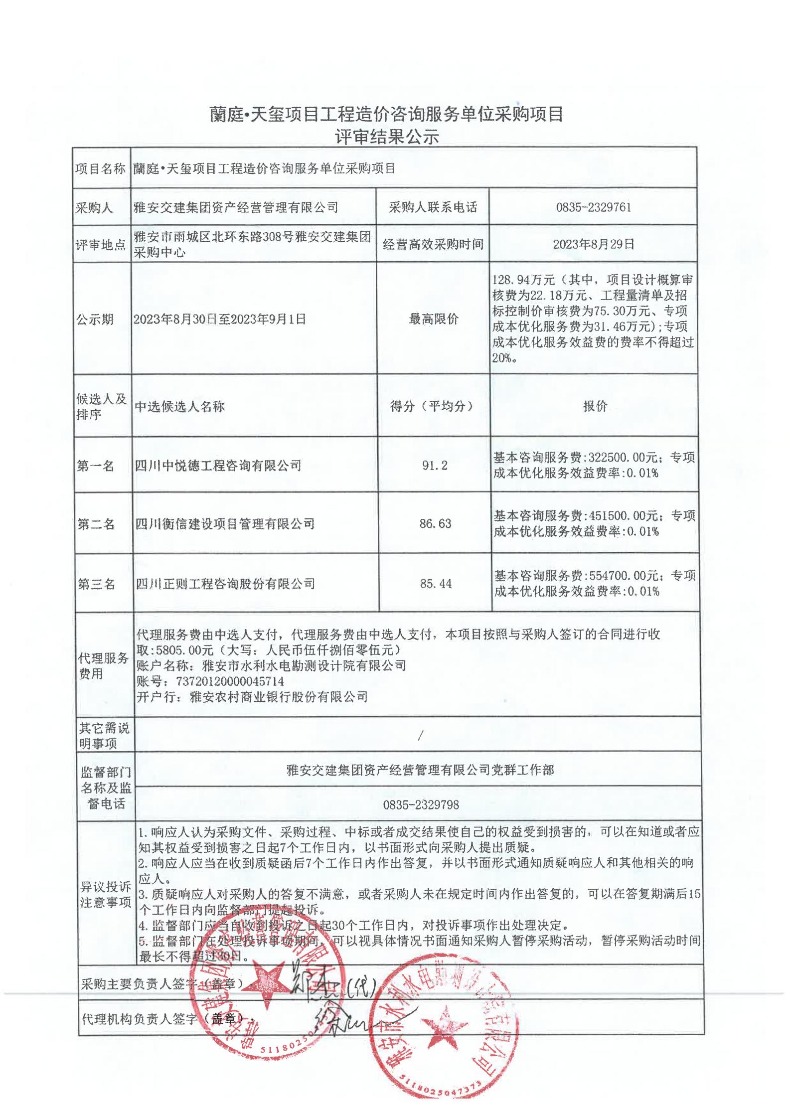 雅安交建集團(tuán)資產(chǎn)經(jīng)營(yíng)管理有限公司蘭庭·天璽項(xiàng)目工程造價(jià)咨詢(xún)服務(wù)單位采購(gòu)項(xiàng)目評(píng)審結(jié)果公示