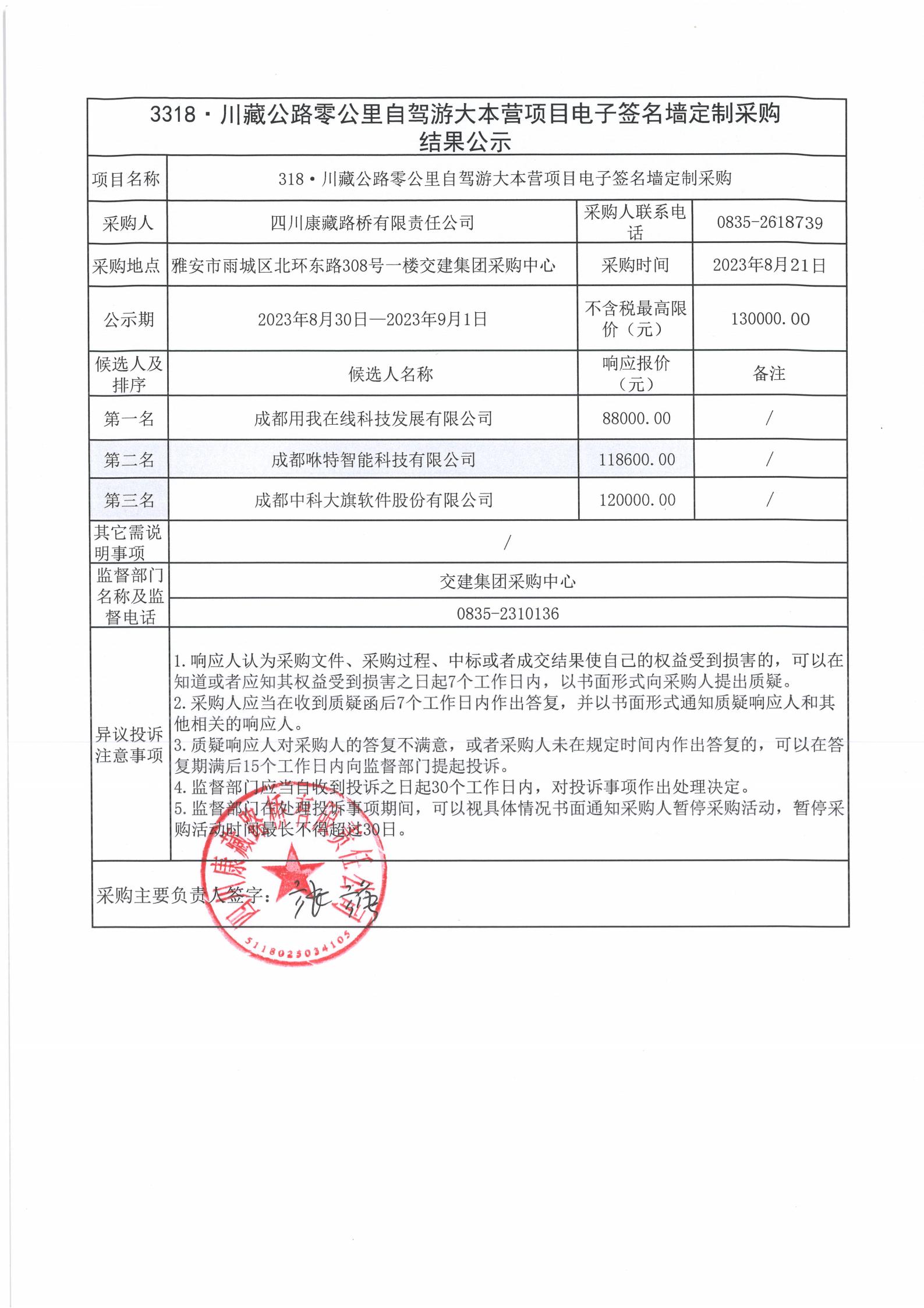 四川康藏路橋有限責任公司318·川藏公路零公里自駕游大本營項目電子簽名墻定制采購結(jié)果公示