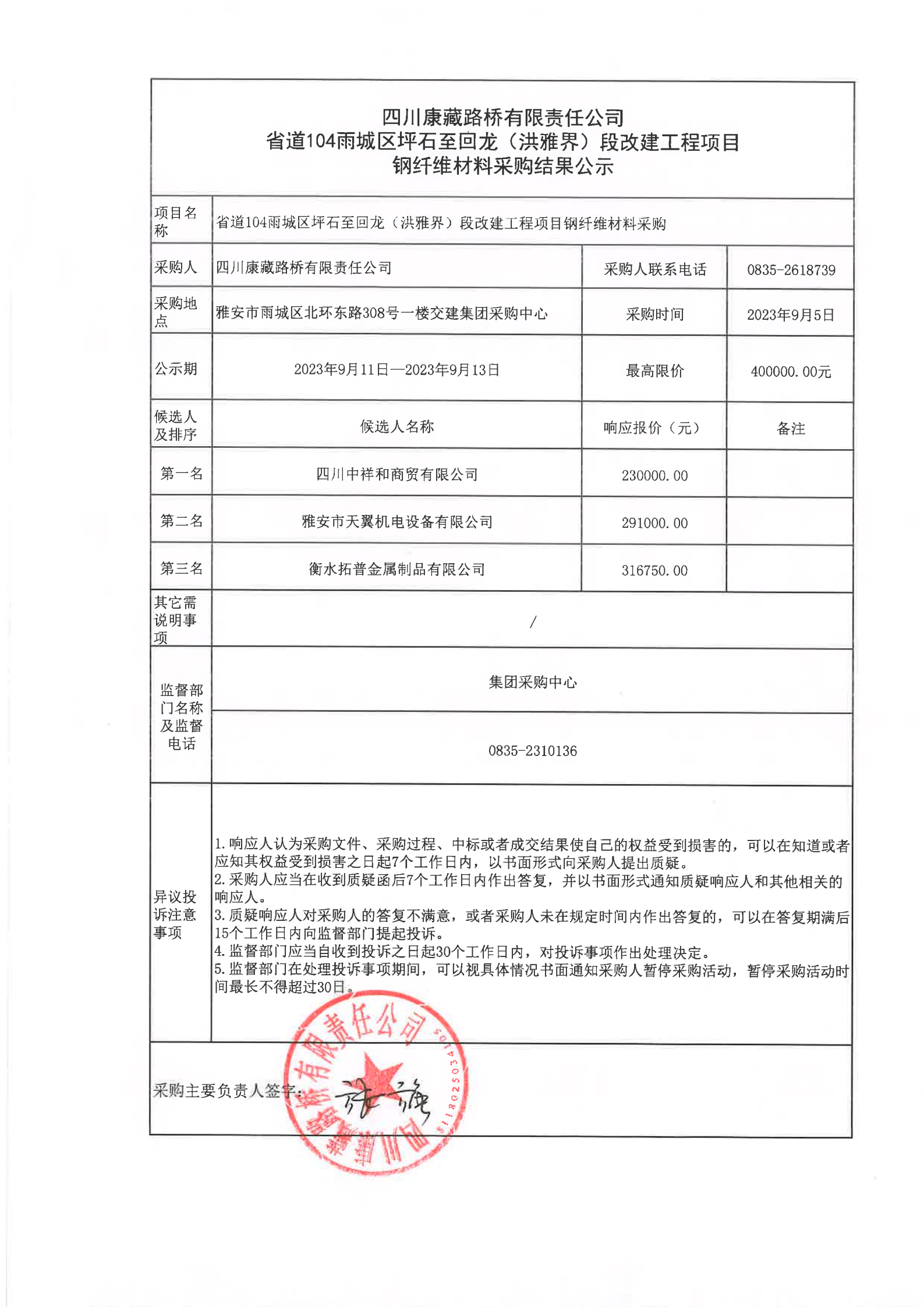 四川康藏路橋有限責任公司省道104雨城區(qū)坪石至回龍(洪雅界)段改建工程項目鋼纖維材料采購結(jié)果公示