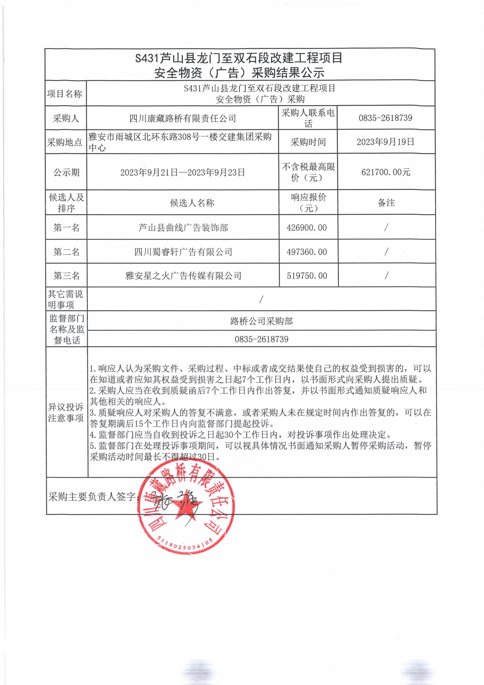 四川康藏路橋有限責任公司S431蘆山縣龍門至雙石段改建工程項目安全物資(廣告)采購結果公示