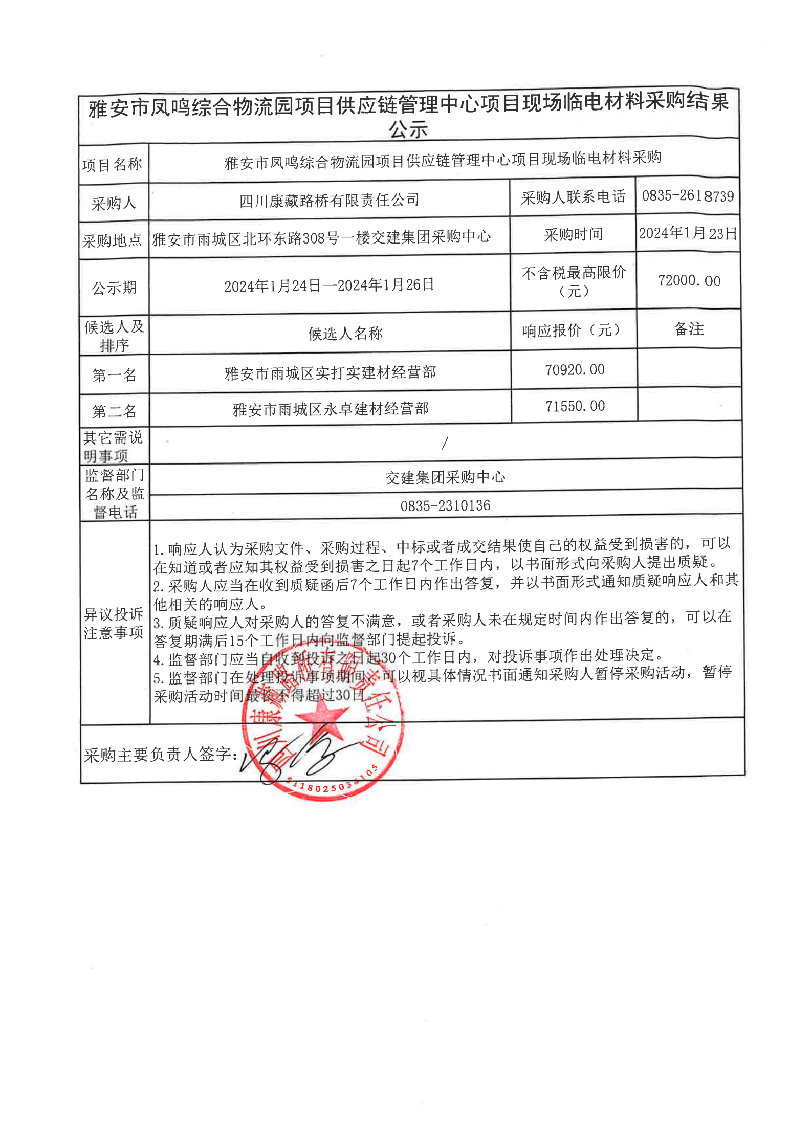 四川康藏路橋有限責任公司雅安市鳳鳴綜合物流園項目供應鏈管理中心項目現場臨電材料采購結果公示