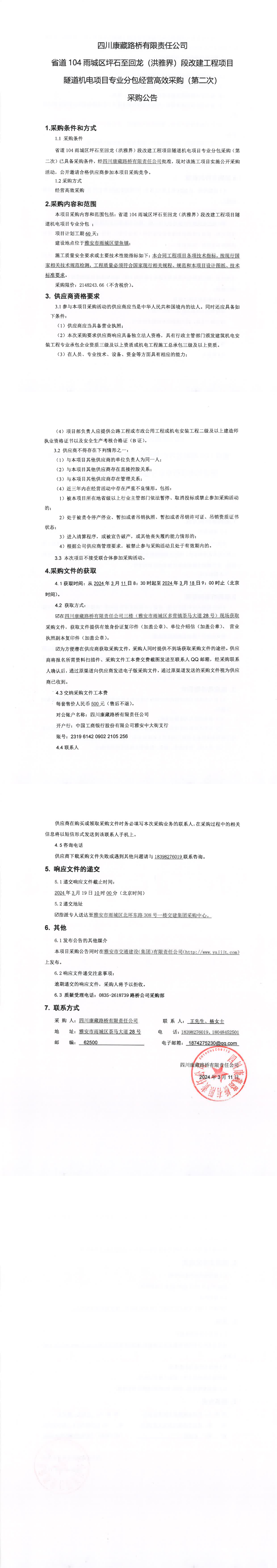 四川康藏路橋有限責(zé)任公司省道104雨城區(qū)坪石至回龍(洪雅界)段改建工程項目隧道機電項目專業(yè)分包經(jīng)營高效采購(第二次)采購公告