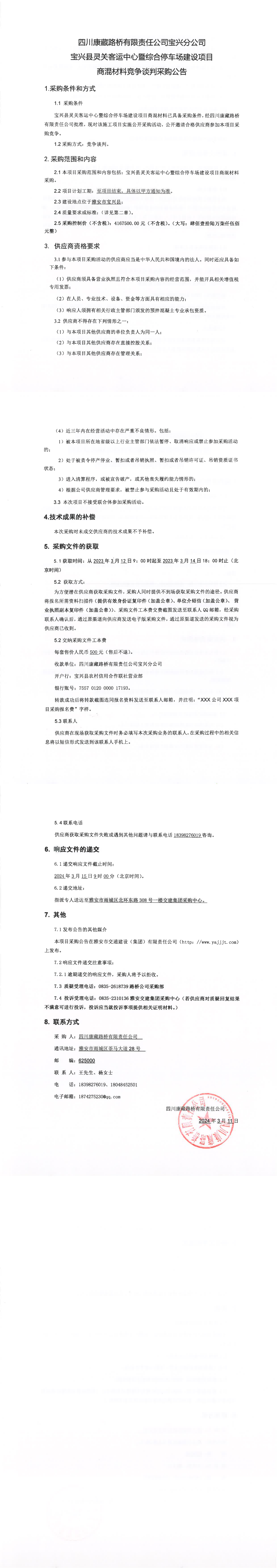 四川康藏路橋有限責(zé)任公司寶興縣靈關(guān)客運(yùn)中心暨綜合停車場建設(shè)項(xiàng)目商混材料競爭談判采購公告