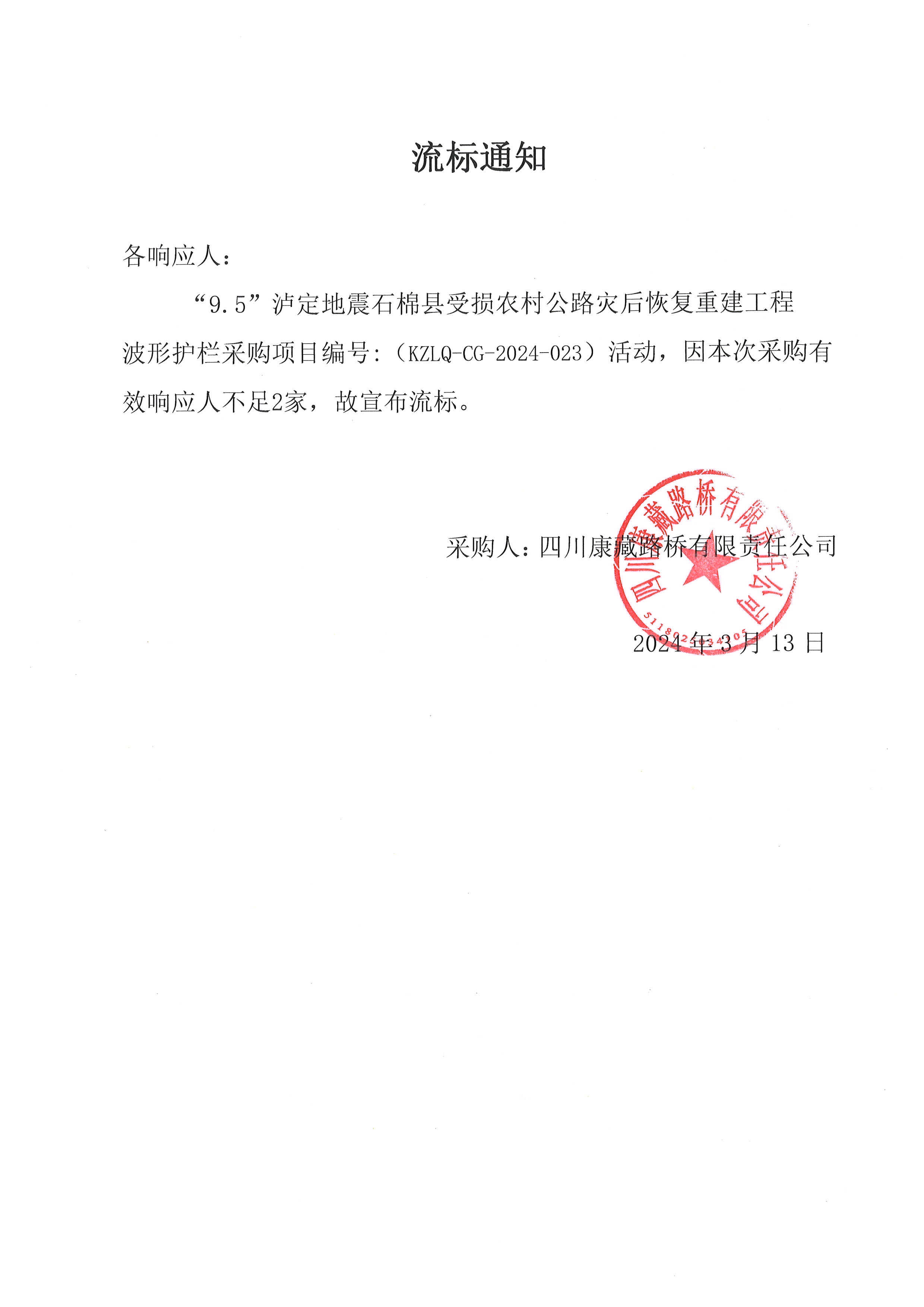 四川康藏路橋有限責(zé)任公司“9.5”瀘定地震石棉縣受損農(nóng)村公路災(zāi)后恢復(fù)重建工程波形護欄采購流標通知