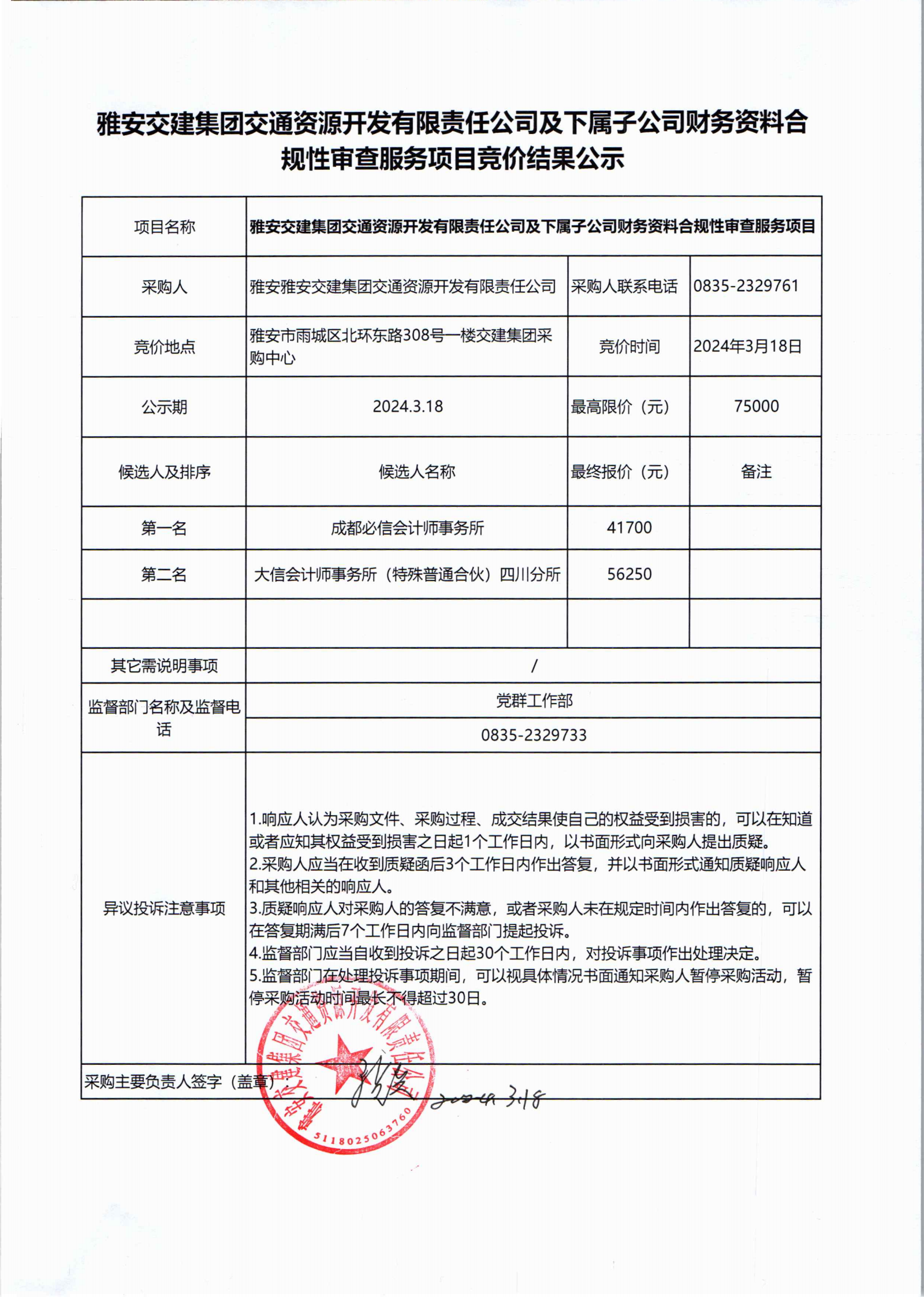 雅安交建集團(tuán)交通資源開發(fā)有限責(zé)任公司及下屬子公司財(cái)務(wù)資料合規(guī)性審查服務(wù)項(xiàng)目競(jìng)價(jià)結(jié)果公示