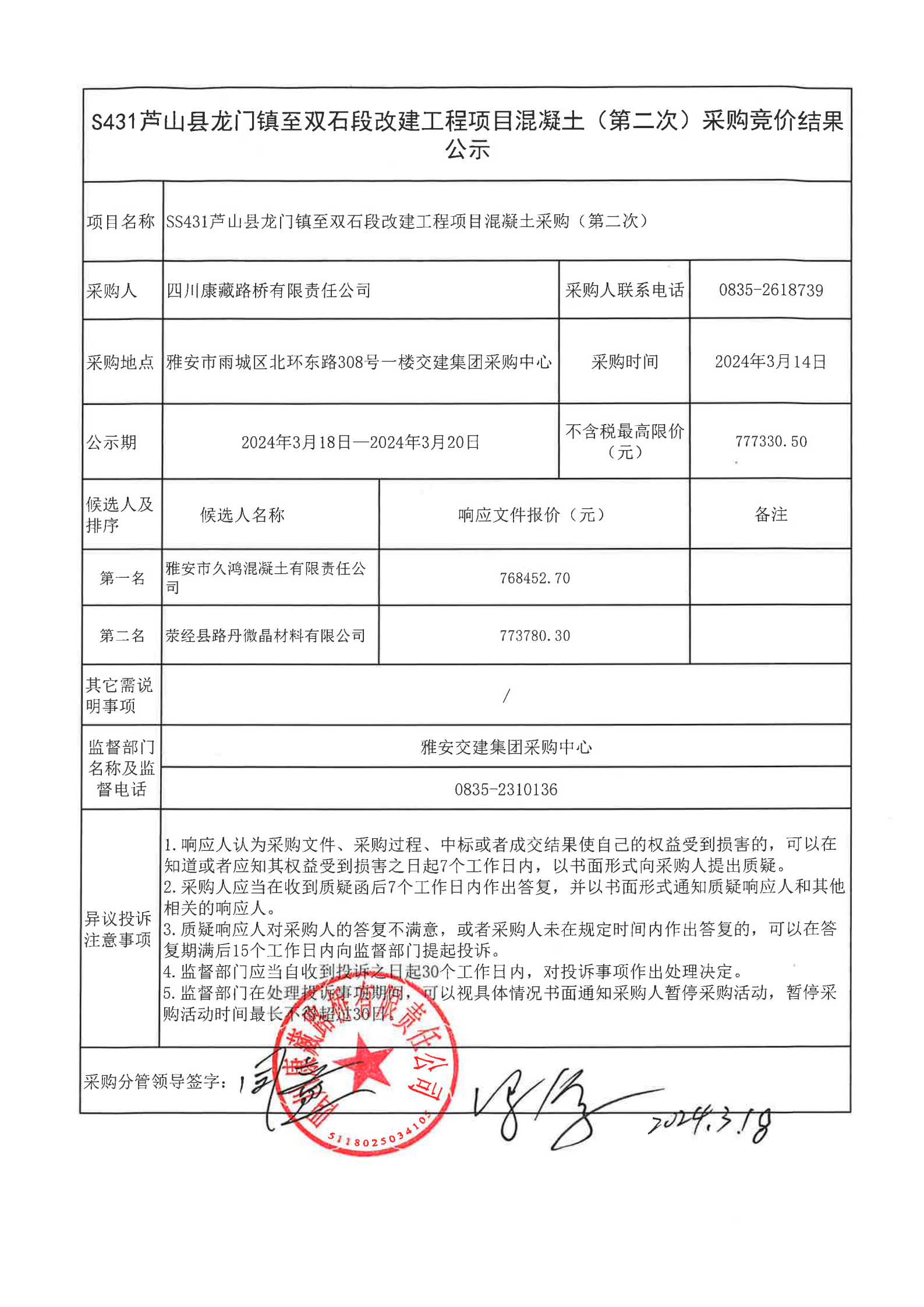 四川康藏路橋有限責任公司S431蘆山縣龍門鎮(zhèn)至雙石段改建工程項目混凝土(第二次)采購競價結果公示