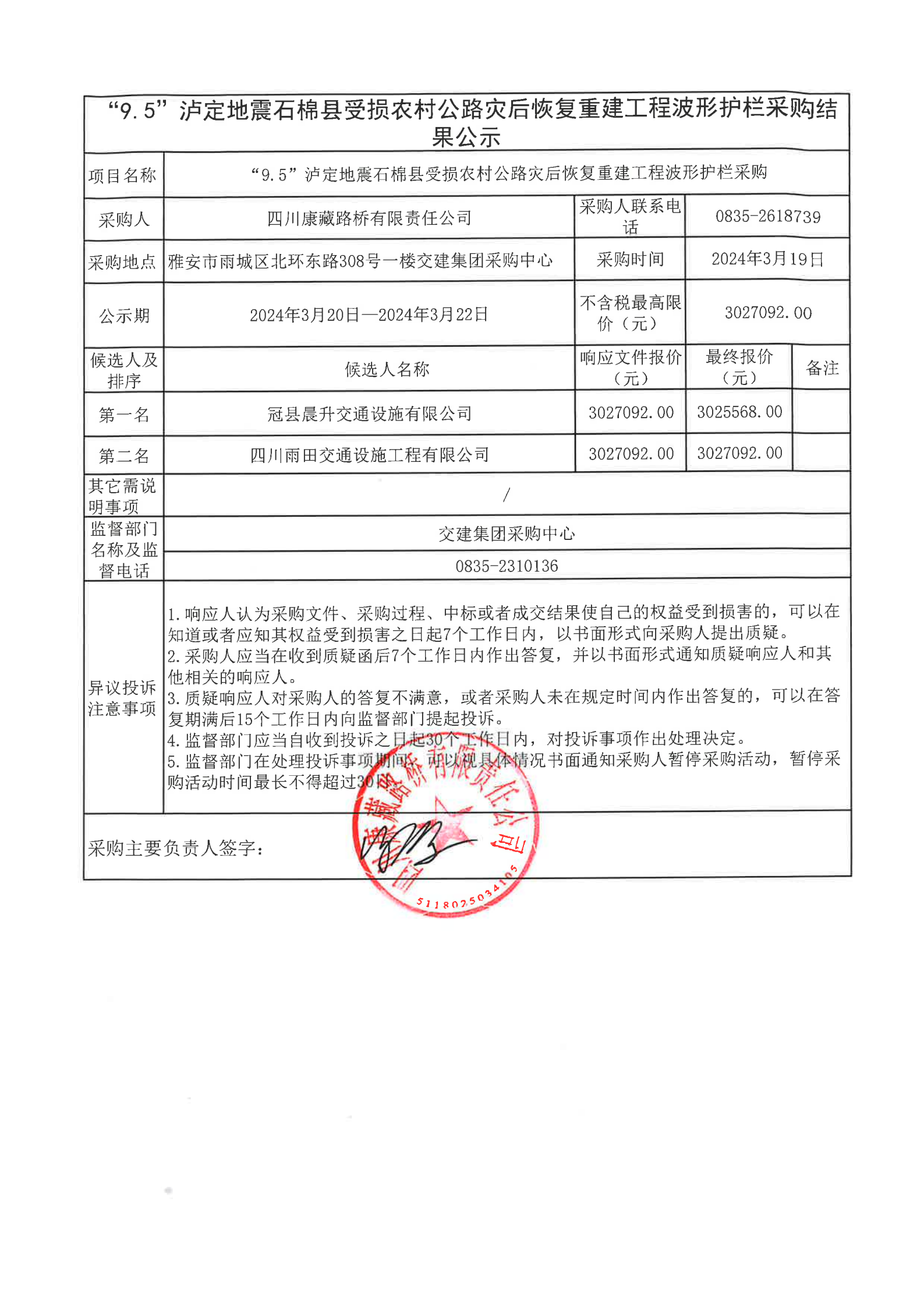 四川康藏路橋有限責(zé)任公司“9.5”瀘定地震石棉縣受損農(nóng)村公路災(zāi)后恢復(fù)重建工程波形護欄采購結(jié)果公示