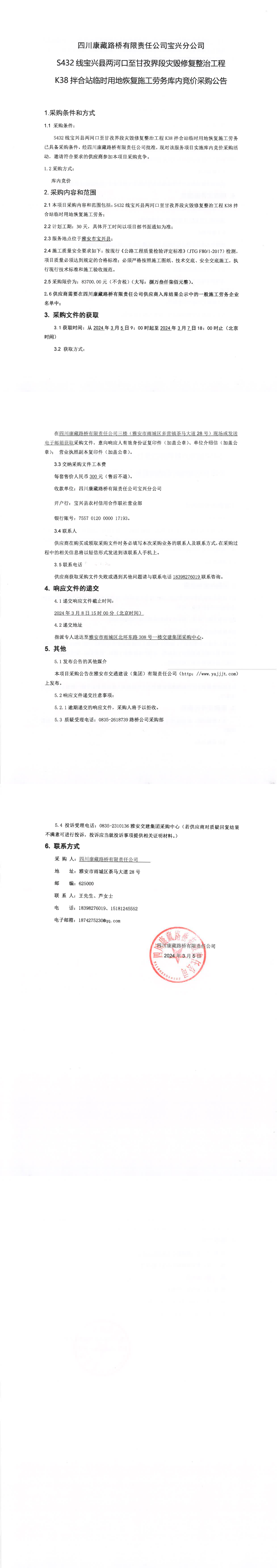 四川康藏路橋有限責任公司S432線寶興縣兩河口至甘孜界段災毀修復整治工程K38拌合站臨時用地恢復施工勞務(wù)庫內(nèi)競價采購公告