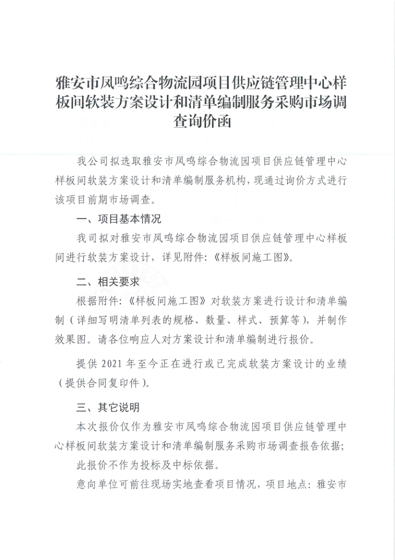 雅安交建集團(tuán)物流發(fā)展有限公司雅安市鳳鳴綜合物流園項目供應(yīng)鏈管理中心樣板間軟裝方案設(shè)計和清單編制服務(wù)采購市場調(diào)查詢價函