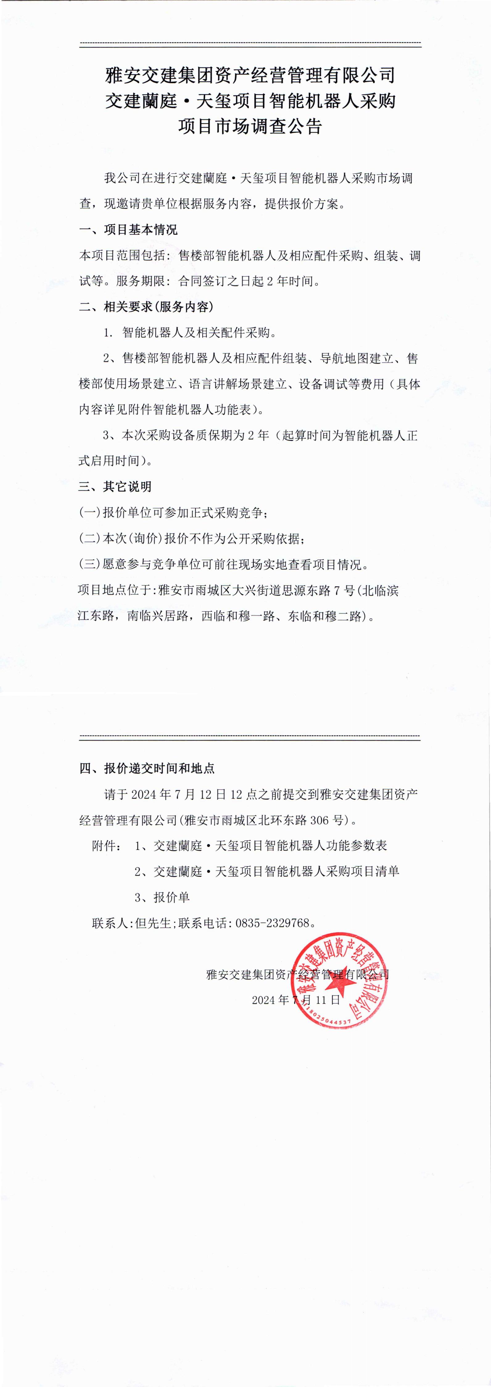 雅安交集團(tuán)資產(chǎn)經(jīng)營(yíng)管理有限公司交建蘭庭·天璽項(xiàng)目智能機(jī)器人采購項(xiàng)目市場(chǎng)調(diào)查公告