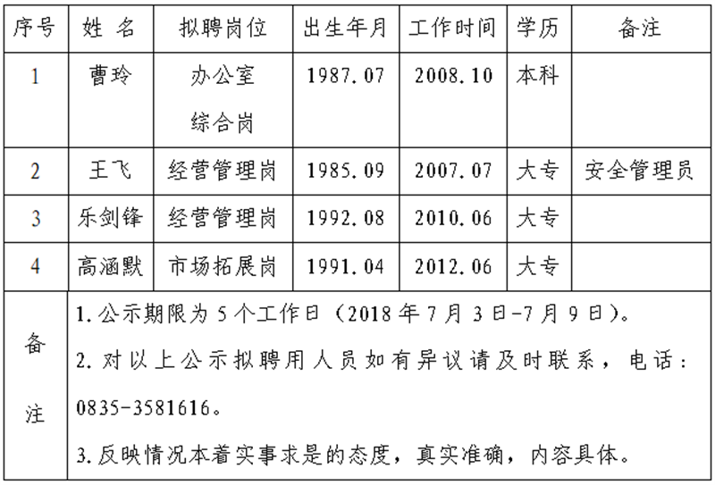 通過公開報名、資格審查、面試等程序,經(jīng)公司研究確定以下