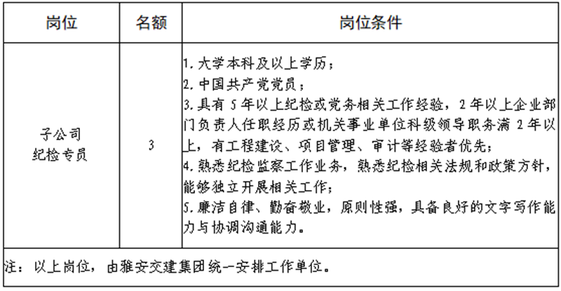 根據(jù)發(fā)展需要,決定面向社會公開招聘雅安市交通建設(shè)(集團)有限責(zé)任公司(以下簡稱“雅安交建集團”)所屬子公司紀檢專員3名,現(xiàn)將有關(guān)事項公告如下:
