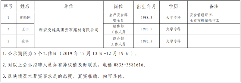 雅安交建集團(tuán)子公司擬聘用人員公示(云石公司)