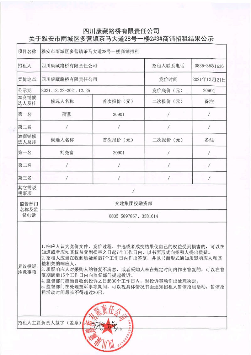關于雅安市雨城區(qū)多營鎮(zhèn)茶馬大道28號一樓2#3#商鋪招租結果公示