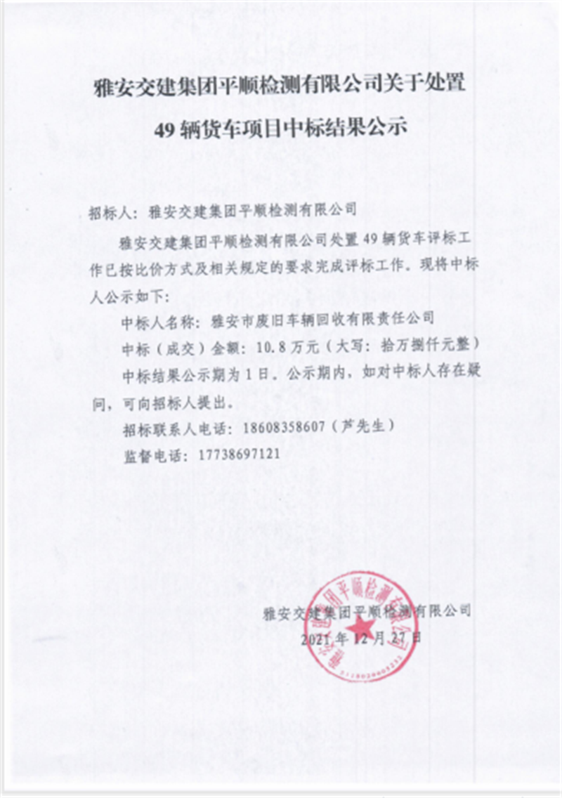 雅安交建集團平順檢測公司關于處置49輛貨車項目中標結果公示