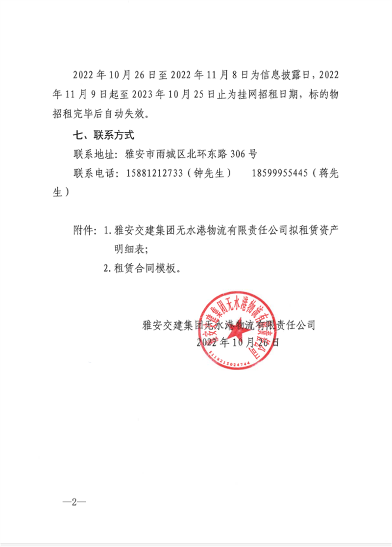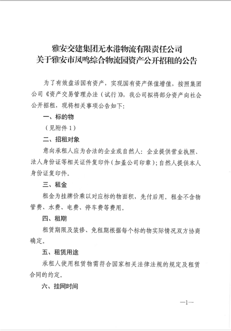雅安交建集團(tuán)無(wú)水港物流有限責(zé)任公司關(guān)于雅安市鳳鳴綜合物流園資產(chǎn)公開(kāi)招租的公告