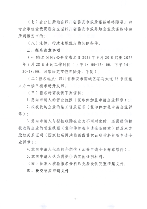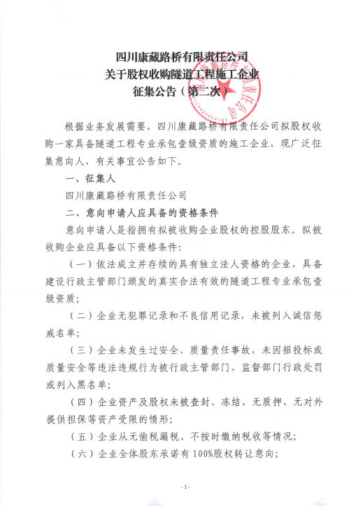 四川康藏路橋有限責任公司關于股權收購隧道工程施工企業(yè)征集公告(第二次)