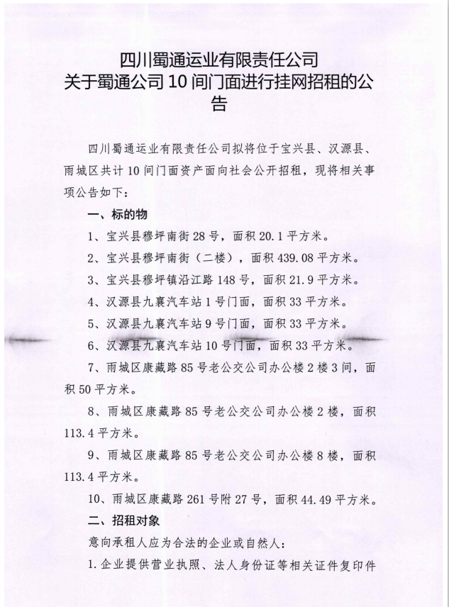 關于蜀通公司10間門面進行掛網(wǎng)招租的公告