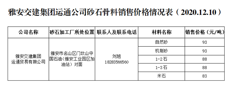 雅安交建集團運通公司砂石骨料銷售價格情況表(2020.12.10)