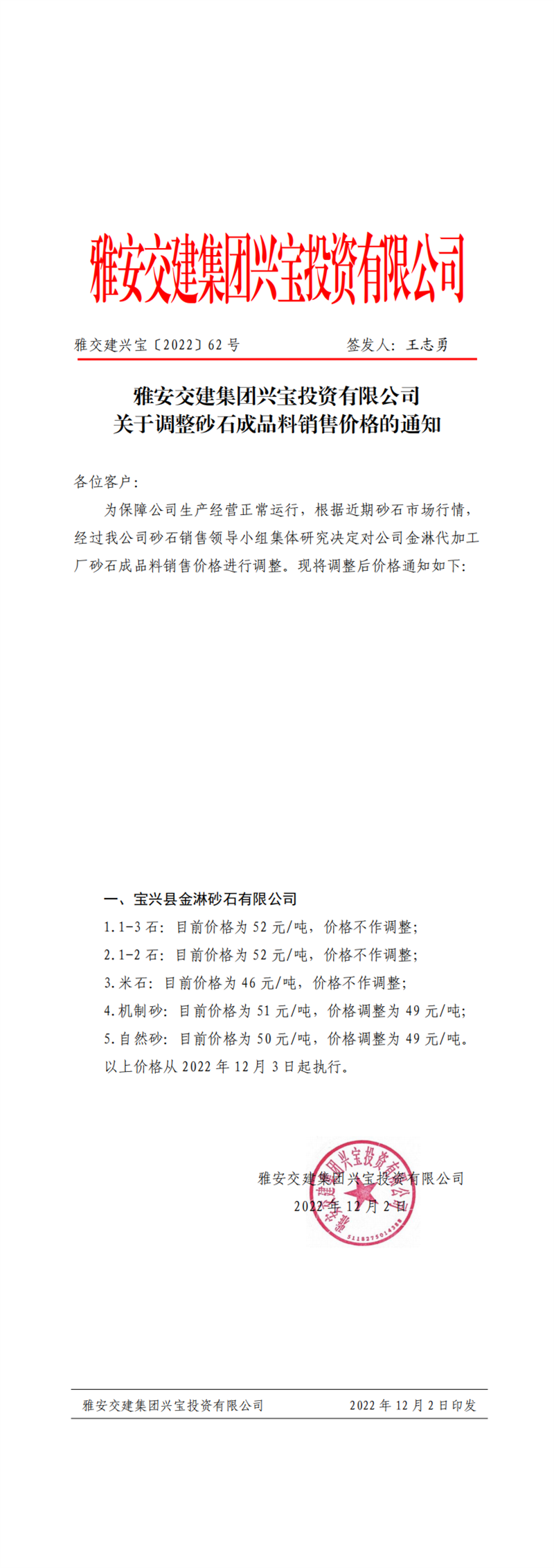 雅交建興寶〔2022〕62號(hào) 關(guān)于調(diào)整砂石成品料銷售價(jià)格的通知(2022-12-2)