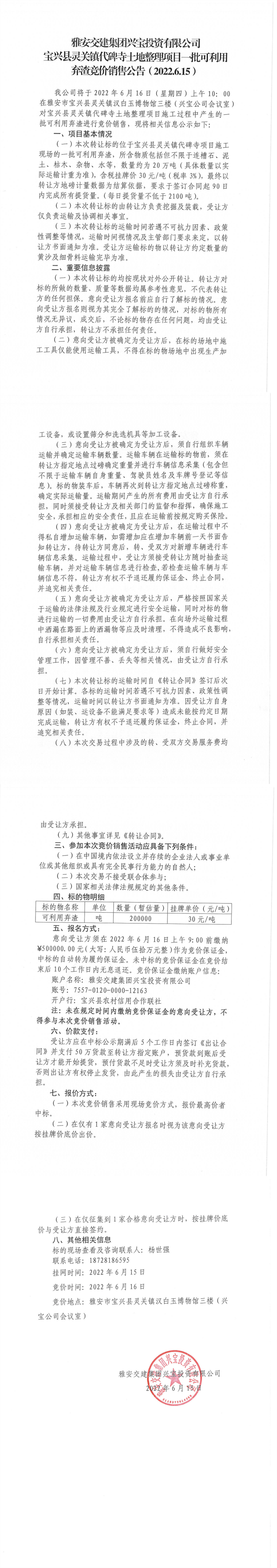 雅安交建集團(tuán)興寶投資有限公司寶興縣靈關(guān)鎮(zhèn)代碑寺土地整理項目-批可利用 棄渣競價銷售公告( 2022.6.15 )