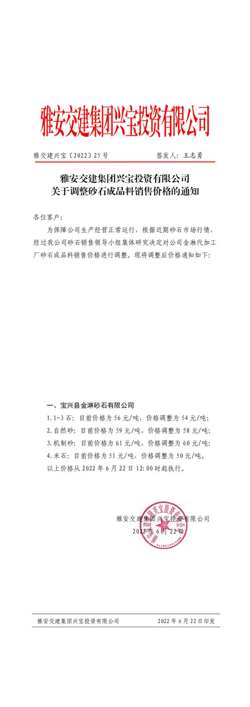 ÑŰ²½»½¨¼¯ˆF(tu¨¢n)ÅdŒšÍ¶ÙYÓÐÏÞ¹«Ë¾ êP(gu¨¡n)ÓÚÕ{(di¨¤o)Õûɰʯ³ÉÆ·ÁÏäNÊÛƒr¸ñµÄ֪ͨ£¨2022-6-22£©