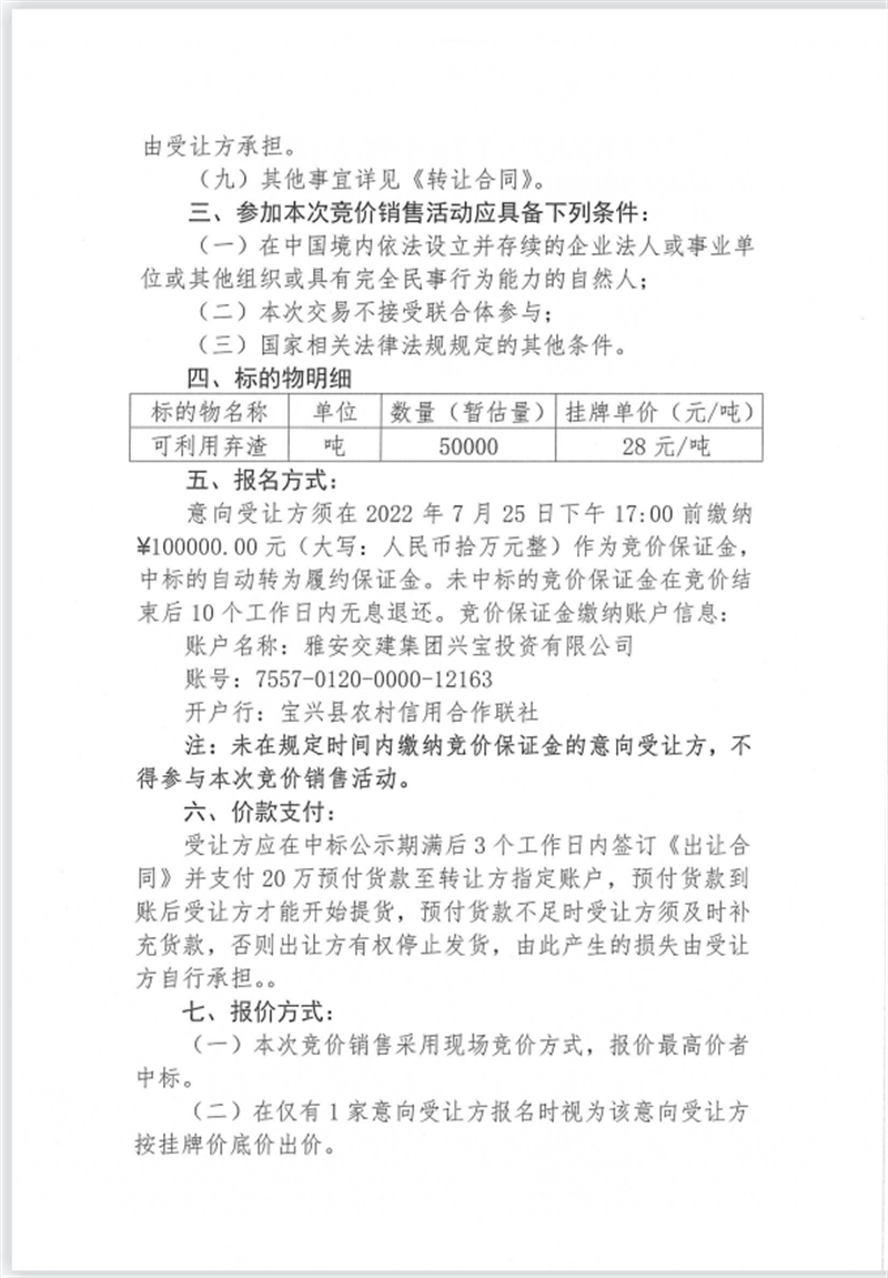 興寶公司寶興縣靈關(guān)鎮(zhèn)代碑寺土地整理項(xiàng)目10萬(wàn)噸可利用棄渣競(jìng)價(jià)銷售掛網(wǎng)公告7.22(10萬(wàn)噸)